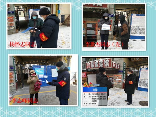 2月12日以来,哈尔滨市委会机关秘书长杨怀志、办公室主任李世杰、调研处处长李志峰、组宣处主任科员杨明新在哈尔滨市道里区西十五道街57号,尚志街道西十五道街社区值守。