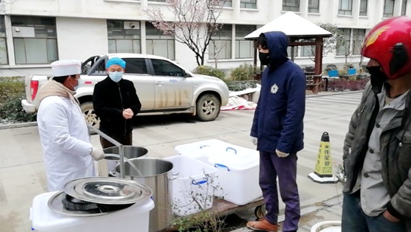 对于医院的生活保障,邓声熔作为总务科科长说:“第一是尽可能减少不必要人员的流动,采取一人一登记的方案。第二是医护和患者的饮水问题,我们直接和饮水公司联系,定点存放饮用水,避免送水人员在病区流动。第三,食堂采取定点定时取餐制。为了让食堂提前运营,我也是大费周章。回族食堂本来预计初八开业,费尽口舌才让他初二营业,当时没有储存的菜品,初二晚售卖的肉都是借来的,但不管怎么说,医院食堂的营业始终解决了全院医护和患者的当务之急。每天我都会去监督食堂的消毒工作,并且教他们如何建立消毒的档案,如何去配比消毒溶液。我们的一线同事在前线很辛苦,让他们“吃好”,是刻不容缓的。”
