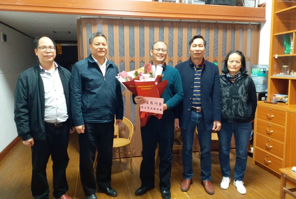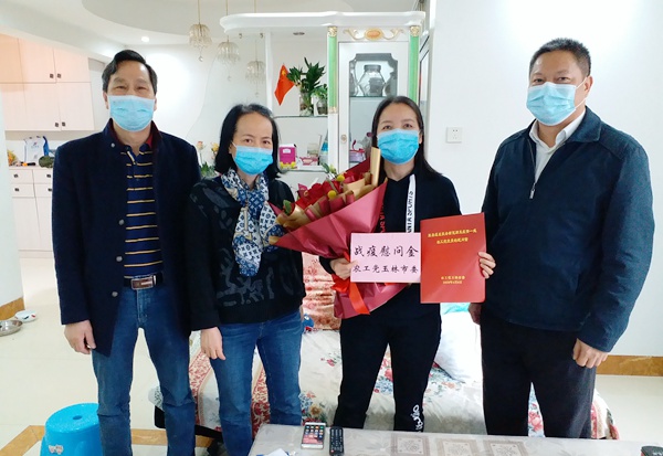 2020年4月8日,农工党玉林市委会主委邹志刚受农工党广西区委会主委蒋和生委托,走访慰问玉林市奋战在新冠肺炎疫情防控一线的农工党优秀党员代表廖铭燕、杨焕彪、周丽冰,为他们送上鲜花、慰问信和慰问金,向他们致以崇高的敬意,送去农工党组织的关怀。农工党玉林市红十字会医院总支副主委梁翠铭陪同慰问。