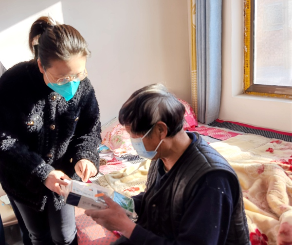 捐赠仪式后,市委会委员、利通区总支主委马阳代表市委会到困难群众利通区党家河湾村村民温志银家,将医疗物资送至急需药品的老人手中,并仔细询问老人身体健康状况,为他讲解药品使用须知。马阳设身处地的叮嘱,科学细致的提醒,朴实暖心的问候,让严冬少了一分凛冽,多了一分温暖。老人领到爱心药包后高兴地说:“谢谢你们给我送来的防疫药,好好好!”