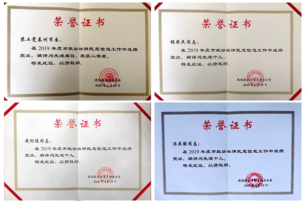 经市政协五届四十七次主席会议审议通过,农工党泰州市委会以综合成绩第三名,荣获二等奖。会上,市政协对2019年度政协信息先进个人进行表彰,农工党党员冯亚强、杨照民、成纪俊被评为先进个人,予以表彰。社情民意《关注埃博拉疫情 加强非洲留学生传染病防控工作》、《药品上市许可人制度亟需配套建设国家级公共服务平台》入选会议材料汇编。