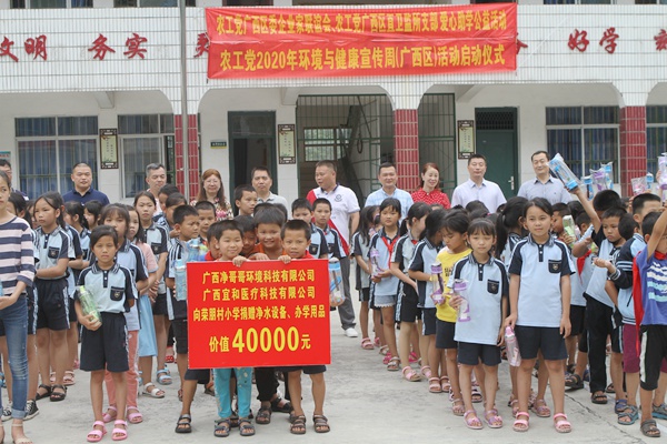 随后,在荣朋村小学举行农工党2020年环境与健康宣传周活动(广西区)启动仪式和爱心助学公益捐赠仪式,区委会联合企业家联谊会、区直卫生监督所支部向荣朋村小学、村委会捐赠直饮水系统、小学厨房净水系统和水杯等价值4万元的物品。