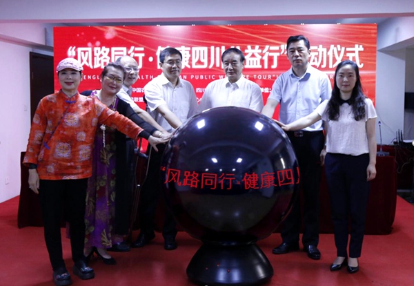 四川省残疾人福利基金会理事长郭爰对“风路同行·健康四川公益行”进行项目介绍,四川省残疾人联合会理事、四川省残疾人福利基金会党支部书记杨生明为“风路同行·健康四川公益行”爱心大使媛凤(四川知名演员)授旗。