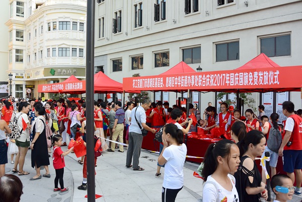 这项活动迄今已连续举办了十二年,每一年都意义非凡。今年国庆,即将迎来中国共产党第十九次全国代表大会的召开,也是厦门刚刚结束金砖领导人厦门会晤,被习总书记点赞,被世界圈粉后迎来的第一个长假。在这样的日子里举办国旗发放活动,既是为祖国强大而感到骄傲自豪的爱国情怀的抒发,也是厦门会晤所展现的“爱国爱家、无私奉献的家园情怀;履职尽责、锐意进取的使命担当;精益求精、善做善成的不懈追求;勇敢坚毅、低调务实的实干作风;开放包容、文明友善的大爱胸襟”等新时期厦门精神的传递。今天的中山路,游人如织,一面面鲜艳的五星红旗在人们的手中传递着,挥舞着,将千言万语汇成一句:“我爱你,中国!”