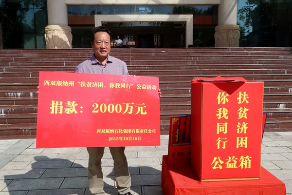 2015年10月16日是全国第二个“扶贫日”,云南省西双版纳傣族自治州举行“扶贫济困、人心向善”公益捐助活动。西双版纳石化集团董事长、2015年全国劳动模范、农工党党员柳天伟捐赠2000万元,用于扶老、助残、救孤、助医、助学等公益慈善、社会福利事业,以实际行动履行企业的社会主体责任。