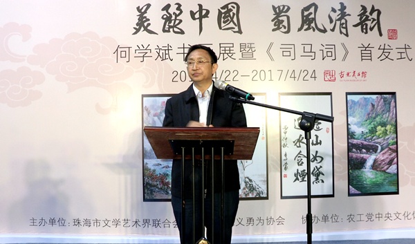 2017年4月22日上午,由珠海市文学艺术界联合会、珠海市见义勇为协会共同主办,农工党中央文化体育工作委员会协办的“美丽中国·蜀风清韵”——何学斌书画展暨司马词首发式在珠海市古元美术馆开幕,农工党中央专职副主席龚建明、全国政协提案委员会副主任罗平飞、国防大学原副政委李殿仁等出席开幕式并致辞。解放军军事科学院副院长徐根初宣布书画展开幕。