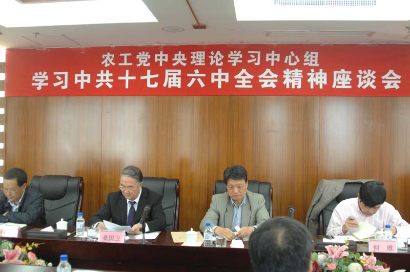 10月19日,农工党中央理论学习中心组举行学习中共十七届六中全会精神专题座谈会。全国人大常委会副委员长、农工党中央主席桑国卫主持座谈会并讲话,全国政协副主席、农工党中央常务副主席陈宗兴出席座谈会并讲话。