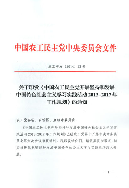 为扎实有效地推进坚持和发展中国特色社会主义学习实践活动在全党深入开展,建设与中国共产党通力合作的、高素质的、有作为的中国特色社会主义参政党,切实承担起中国特色社会主义亲历者、实践者、维护者、捍卫者的政治责任,农工党中央制定了《中国农工民主党开展坚持和发展中国特色社会主义学习实践活动2013-2017年工作规划》(以下简称“《工作规划》”),经2014年
