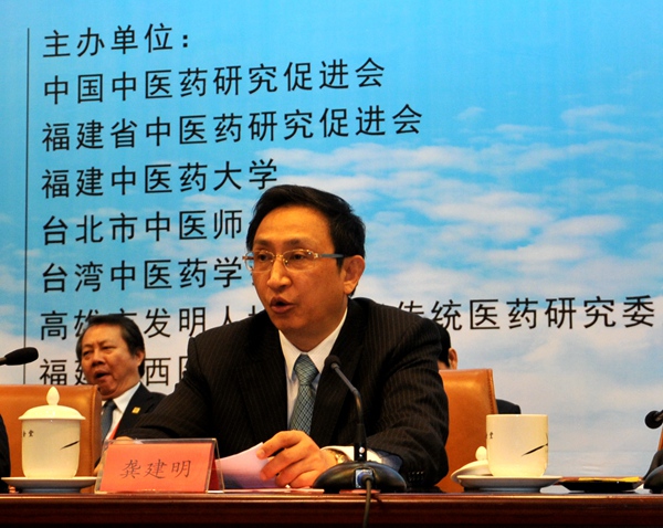 龚建明在致辞中说,海峡两岸的中华医药文化同宗同祖,尤其是福建与台湾两地,受到气候条件、生产生活资料等生态环境的影响,形成了诸多具有鲜明民族和地方特点的传统医药文化活动和中医药体系。我们很高兴地看到,二十多年来,随着两岸中医药界交流合作的不断加强,两岸中医药同仁在中医药标准化、规范化、现代化研究等方面进行了一系列积极有效的探索,取得了明显进步,形成了良好的发展态势。随着中国走向世界步伐的加快和国际地位的提高,作为中国原创的、富有中华文化内涵的、关系民生健康的中医药,毫无疑问应该承担起为世界人类健康做出中华民族应有贡献、彰显中华文化的重任。在2014年诺贝尔奖获得者医学峰会暨院士论坛上,全国人大常委会副委员长、农工党中央主席陈竺同志对“如何实现现代医学与中医药学共融发展”提出了三点要求:第一,充分发挥中西医的各自优势,互相配合,互为补充;第二,找准现代医学与中医药学共融发展的切入点;第三,加强中西方医学领域的交流与合作。这给现阶段如何更好促进中医药事业发展提出了宝贵建议。中医药要想走向世界,必须在中医药理论的基础上充分运用现代的科学技术,吸收现代的科学技术方法,用现代化的研究方法、剂型直至语言的表述,让西方人来理解和接受它。从全球疾病的发生情况来看,慢性病已经成为最大的威胁,而中医药在慢性病的防治上有很大的优势,这也是中医药走向国际的最佳时期。因此,无论是海峡两岸中医药界的学者还是中药生产企业,都应该把握好这个良机。