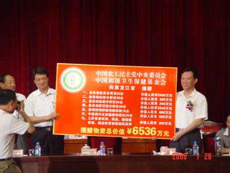 会上,中国初级卫生保健基金会向黑龙江省捐赠了价值6536万元的医疗设备和药品。