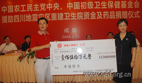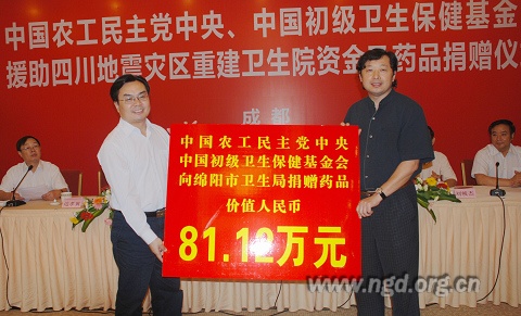 农工党中央这次捐赠资金660万元,援建我省成都、德阳、绵阳、雅安等地震灾区1个县妇幼保健院、3个乡镇卫生院、1个乡镇畜牧兽医站和15个村卫生室。同时,中国初级卫生保健基金会向我省灾区和贫困地区捐赠了价值486万元的药品,这些药品已经分发到成都、绵阳、广元、宜宾、巴中和攀枝花市。