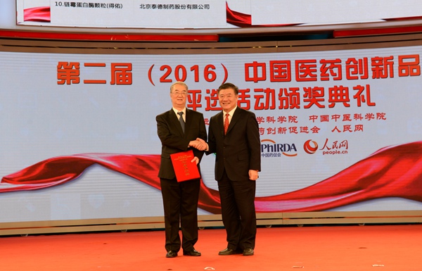 2017年3月12日晚上,由中国医学科学院、中国中医科学院、中国药促会和人民网联合主办的“第二届(2016)中国医药创新品牌系列评选活动”颁奖典礼,在人民日报社人民网1号演播厅举行。十二届全国人大常委会副委员长、农工党中央主席陈竺,十一届全国人大常委会副委员长、中国工程院院士、国家重大新药创制科技重大专项技术总师、农工党中央原主席桑国卫,全国政协副秘书长、农工党中央副主席何维出席颁奖活动。