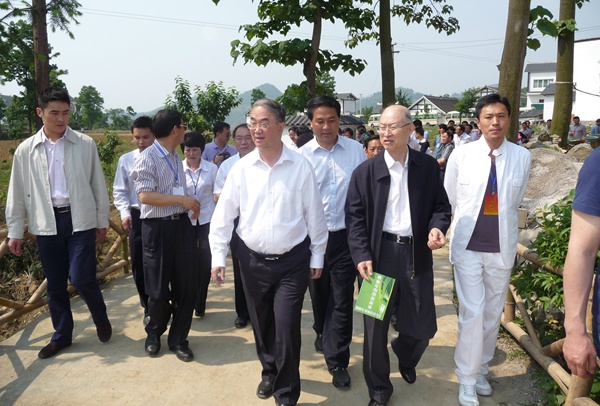 2013年6月15日,农工党中央常务副主席刘晓峰(左四),副主席龚建明(左五)、谢庆生(左三)在竹园乡考察调研