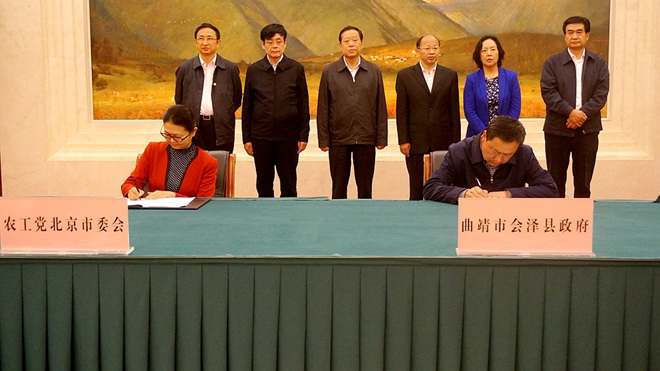 2017年10月13日上午,农工党助力云南脱贫攻坚帮扶项目签约暨捐赠仪式在昆明市举行。全国政协副主席、农工党中央常务副主席、农工党中央精准扶贫精准脱贫工作领导小组常务副组长刘晓峰,中共云南省委副书记李秀领,全国政协副秘书长、农工党中央副主席、农工党中央精准扶贫精准脱贫工作领导小组副组长何维,全国人大常委会委员、环境与资源保护委员会副主任委员、农工党中央副主席、农工党中央精准扶贫精准脱贫工作领导小组副组长龚建明,中共云南省委常委、省委统战部部长杨宁,云南省政府副省长何金平出席。签约仪式由农工党中央精准扶贫精准脱贫工作领导小组办公室主任、云南省委会主委杨鸿生主持。