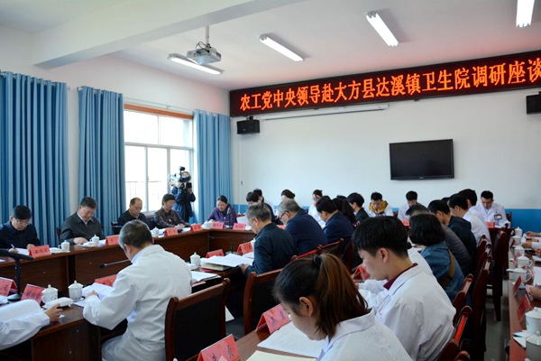 3月20日上午,农工党中央赴大方调研组在听取达溪镇卫生院周开院长的现场介绍后,来到院综合楼四楼会议室,与同心全科特岗医生座谈。会议室不大,以至于镜头都没有足够的角度来拍摄会场全景。但是在空间有限、布置朴素的会议室里,参会人员用点点滴滴的事例回顾了同心全科医生特岗人才计划的诞生、成长历程,年轻的特岗医生结合自身学习、从业经历,畅所欲言,讲述了他们作为第一批接受资助、规范培训的特岗医生扎根基层所发挥的作用,表达了要到偏远的山区承当“健康守门人”、回报社会的意愿;提出了加强县乡村医共体建设,实行全科医生轮岗服务,实行县域医共体岗位排班制的诸多建议。