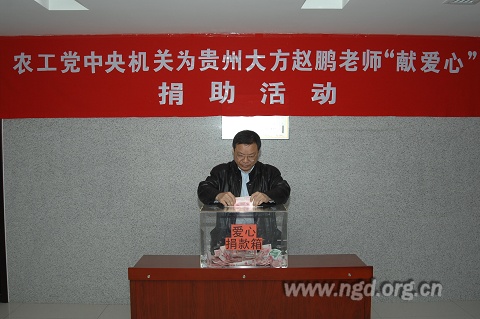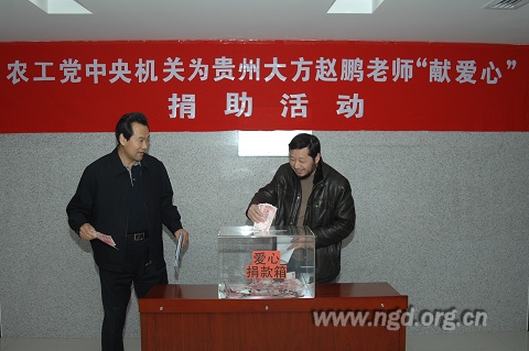2009年12月15日下午,农工党中央机关二层大厅举行了隆重的捐款仪式,农工党中央机关工作人员积极踊跃地为患病的赵鹏老师捐献爱心款。