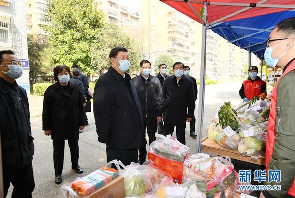 习近平在武汉市东湖新城社区生活物资集中配送点,详细询问社区群众生活物资采购和供应情况。 新华社记者 谢环驰 摄