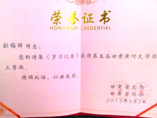 刘锡祥酷爱文学,早在上世纪80年代,其作品就散见于甘肃省内外的各类报刊,且有一定的影响。此次获奖的诗集《岁月沉香》由华夏出版社出版,集中收录了刘锡祥自上世纪70年代至今的近200余篇诗歌作品。