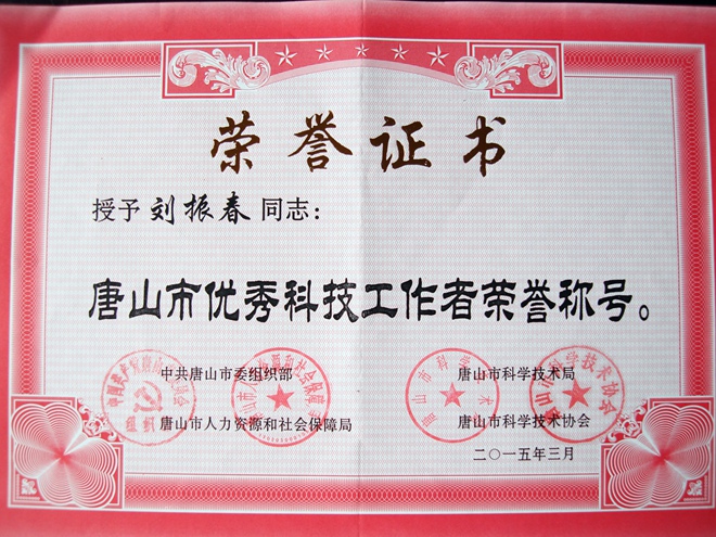 唐山农工党党员刘振春荣获市“优秀科技工作者”荣誉称号