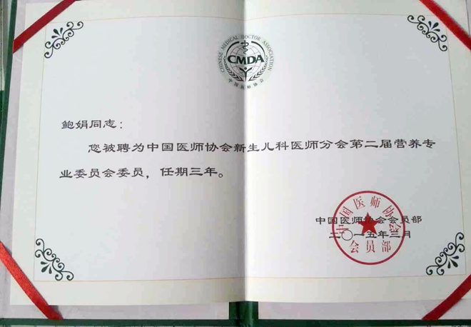 2015年3月26日,农工党通化市人民医院支部主任委员、市人民医院儿科主任,鲍娟同志荣获中国医师协会新生儿科医师分会第二届营养专业委员称号。