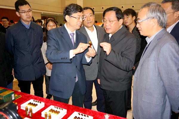 谢恬教授(左二)向李强省长(右二)、张鸿铭市长(左三)展示荣获国家科技进步二等奖的抗癌新药榄香烯乳注射液及榄香烯口服乳