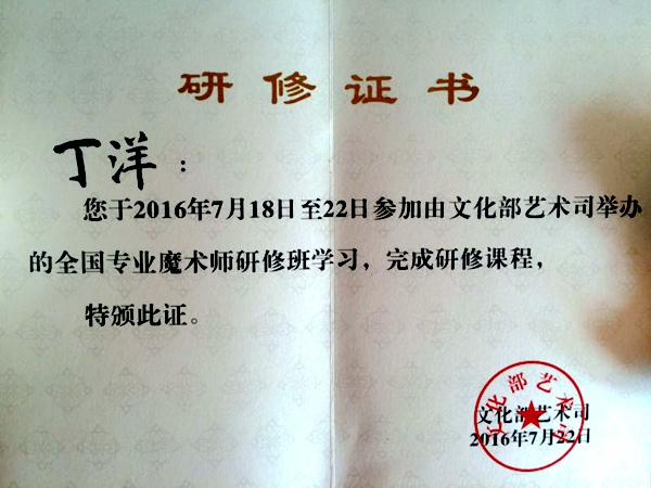 2016年7月18日至22日,农工党江苏省南通市文教支部党员、著名的魔术大师“白鸽皇后”丁洋同志在上海参加了由国家文化部艺术司举办的2016全国专业魔术师研修班学习,完成了规定的研修课程,获得了文化部艺术司颁发的研修证书。