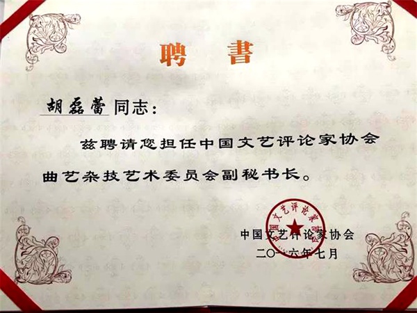 2016年7月25日,中国文艺评论家协会曲艺杂技艺术、视听艺术、音乐舞蹈艺术、网络文艺委员会成立仪式在京举行。苏州农工党党员、国家一级编剧胡磊蕾被聘为中国文艺评论家协会曲艺杂技艺术委员会副秘书长。仪式上,中国文联党组成员、副主席、书记处书记、中国文艺评论家协会副主席夏潮和中国文艺评论家协会主席仲呈祥为其颁发聘书。