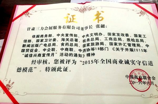 其中,农工党兰州市委会直属基层委副主委、甘肃三力会展服务有限公司董事长张勰被授予“2015年全国商业诚实守信道德模范”荣誉称号。