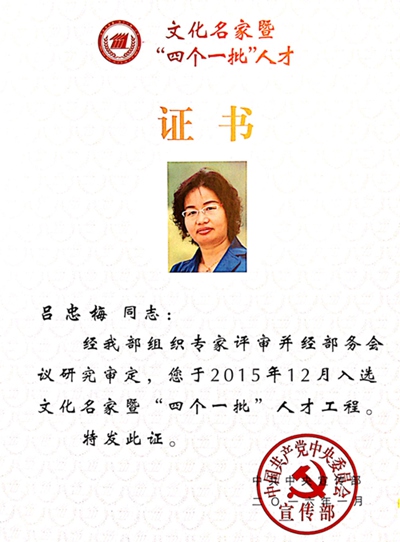 经中共中央宣传部组织专家评审并经部务会议研究审定,全国政协社会和法制委员会驻会副主任,农工党湖北省委会主委吕忠梅于2015年12月入选文化名家暨“四个一批”人才工程。