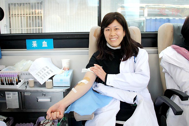 朱雪峰主任献血后稍事休息便和同事回到紧张的医疗工作中去,还有几台手术等着他去做。朱主任已经连续好多年参加无偿献血活动,他常说:“工作中经常会接触到一些急需要用血的病患或情形,时间是生命,血液也同样是生命,无偿献血,我们医务人员更加责无旁贷。” 曹维美副主任护师,在临床一线操劳了十多年,因为身体原因现在医保办工作,入党一年多来,积极参加支部组织活动,这次听说医院组织无偿献血活动,也踊跃报名。第一次参加献血,内心有点小害怕,但她在临床一线多年,深知临床用血紧张的情形,她毫不犹豫地撸起袖子接受了预检,当得知血液合格可以献血时,她开心地笑了,笑得那么灿烂。(施健美)
