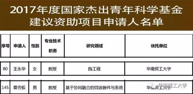2017年8月4日,备受关注的2017年度国家杰出青年科学基金建议资助人名单正式出炉,来自96家科研单位的200名科学家入选其中。华南理工大学总支副主委华南理工大学食品科学与工程学院教授王永华成功入选。