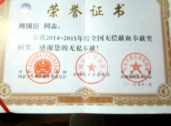农工党党员周国臣常年义务献血获铜奖