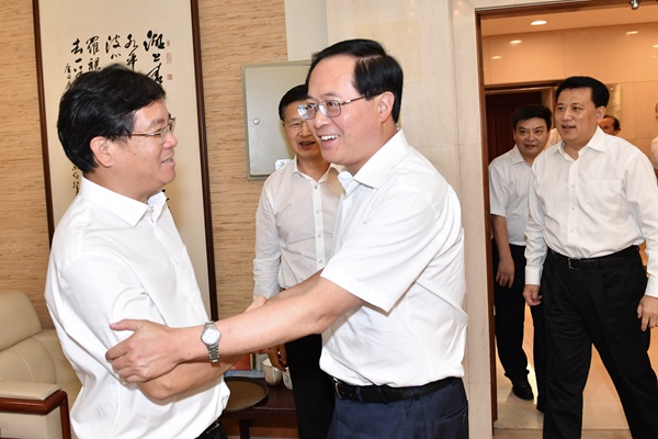 中共浙江省委书记车俊等领导看望获奖者,车俊与丁列明(左一)握手