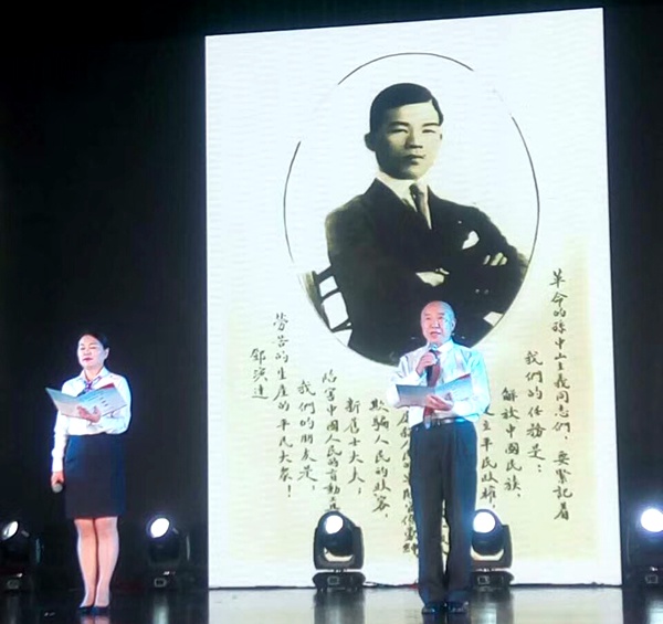 2017年10月12日下午,谭家麟(右)参加中共杭州市临安区委统战部主办的主题为“共筑同心梦 聚力新临安”的临安区统战系统文艺汇演,他表演的节目名称是配乐诗朗诵《中国农工民主党党史长歌》。