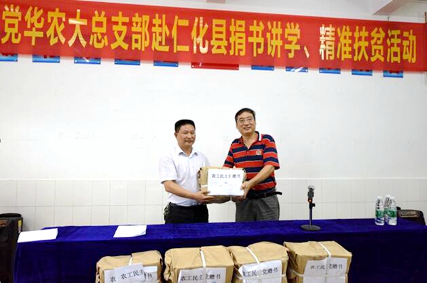 倪教授努力为总支打造集社会服务、组织生活、思想教育于一体的社会服务精品项目。在他的带领下,农工党华农大总支2013年赴雷州八中开展“捐书讲学”活动,捐书6000册;向500位中学生作“做一个心理健康的好同学”报告一场。2014年,他赴龙川义都开展“捐书讲学、送医送药”活动,捐献图书3000册、药品5000多元;接诊病人100多人次,上门诊疗病人3人;为200多名初中生作“中学生人生规划”报告一场。2015年,他赴封开县长岗镇开展“捐书讲学、关爱留守儿童”活动,捐赠2000册图书;为中学生们作了题为“走向心理健康”的讲座一场;为近百名留守儿童做了体检。2016年,他赴韶关仁化周田开展“捐书讲学、精准扶贫”活动,捐赠给周田中学6000元的图书;作了《中学生人生规划》、《两学一做,脱贫致富》专题报告;向平甫村柑桔果农作先进栽培技术辅导;为贫困家庭、留守老人进行健康体检;对平甫村古迹、农业文化遗产、旅游资源进行调研,为发展乡村旅游、建设美丽乡村出谋划策。经过倪教授的不懈努力,华农大总支捐书讲学公益活动内容逐年丰富,影响日益扩大。