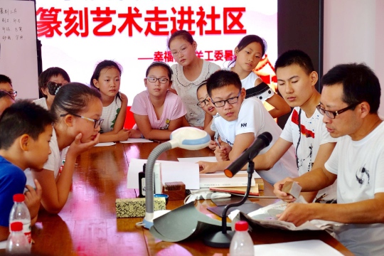 农工党党员、中国首届书法兰亭奖获得者罗荣应邀给暑期孩子讲授篆刻艺术