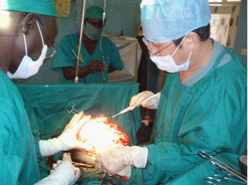 我所在的医疗点位于喀麦隆最北端,主要负责其北方省居民的医疗服务,因与乍得、尼日利亚相距不远,也常有那里的人前来看病。其实这里省级医院的医疗水平并不低,好多手术都能开展,医疗队因为手术免费,所以服务群体大多是看不起病的穷苦人,他们中常能见到国内很难一见的极端病例。我曾经就给一位妇女切出过一个重达21kg的畸胎瘤(见上图),还有一位老人睾丸鞘膜积液直径居然大到35cm。医疗队简单分科为内、外、妇儿和骨科,我负责外科,手术条件与国内无法比拟,有些器械配件缺失磨损严重,必须自己改造制作。二年中我尽自己所能创造条件,开展了颈淋巴清扫,巨大胸壁肿瘤切除,肾盂积石切开取出,膀胱次全切除输尿管移植,前列腺摘除,胃癌、结肠癌根治,胰腺囊肿内引流,肝段切除等多种大中型手术,为医疗队争了光,受到了喀方医务人员和当地群众的尊敬。在喀麦隆,住院患者艾滋病检出率达四分之一,我做过手术的好多患者术前艾滋病抗体检查就是阳性。可以说每次手术都面临着危险的职业暴露,克服它只有一种办法,那就是胆大心细。医务人员中也有几个感染有艾滋病毒,他们都很释然,也没有人在相处中刻意回避他们,大家对待艾滋病人的态度有点象国内人们对待乙肝病人一样,从没见过他们大惊小怪,指指点点。喀麦隆也是高疟区,医疗队员中能幸免不染者很少。