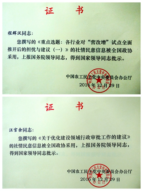 农工党重庆市委会有2篇社情民意信息得到国家领导人批示。江北区委会党员程辉汉撰写的《(重点选题)关于“营改增”试点全面推开后的担忧与建议》、渝北区委会副主委汪官余撰写的《(重点选题)关于建筑领域行政审批制度改革的建议》社情民意信息分别被全国政协采用,上报国务院领导同志,得到国家领导人批示。(易洪民)