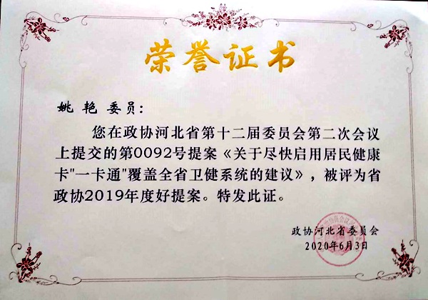 2020年6月3日,河北省政协十二届十四次常委会议上对获评“省政协2019年度好提案”的提案者进行了表彰。农工党河北省委会四件提案和农工党党员姚艳的个人提案获评2019年度好提案。