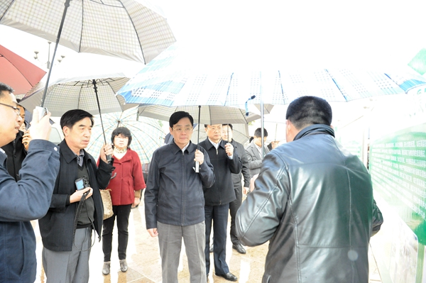 调研组首先来到位于开县汉丰湖的水位调节坝,此时天公不作美,下起雨来。何维副主席在听取了工作人员的简单介绍后,他亲自打着雨伞来到调节坝附近查看此处消落带的生态环境。调节坝周边的环境由于受水位影响,裸露的地表像一片沼泽地,还有待进一步规划治理。他不时地向陪同的开县县委书记李应兰询问,了解相关情况。紧接着,调研组一行冒雨来到城南故津广场,何维副主席与李应兰边走边亲切交谈,他对开县政府治理消落带的生态环境所取得的成绩表示肯定和赞许。在广场,工作人员向何维副主席介绍开县汉丰湖国家湿地公园对外科研合作情况时,何维副主席立即向开县的领导介绍了身边的专家杨忠岐,请他给予指导。