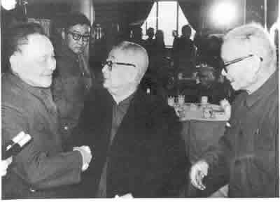 1979年11月,邓小平(左)在北京人民大会堂宴会厅亲切会见周建人(中)、农工党中央主席季方(右)。