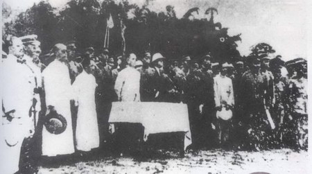 孙中山(台后立者)视察黄埔军校时发表演说,前右一为邓演达