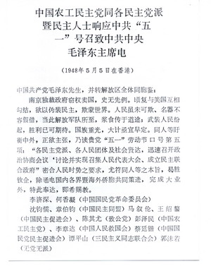 1948年4月30日,中国共产党发出“五一”号召,提议召开新政治协商会议,讨论成立民主联合政府。农工党立即于5月5日同各民主党派暨无党派人士联名致电中共中央主席毛泽东,表示响应。