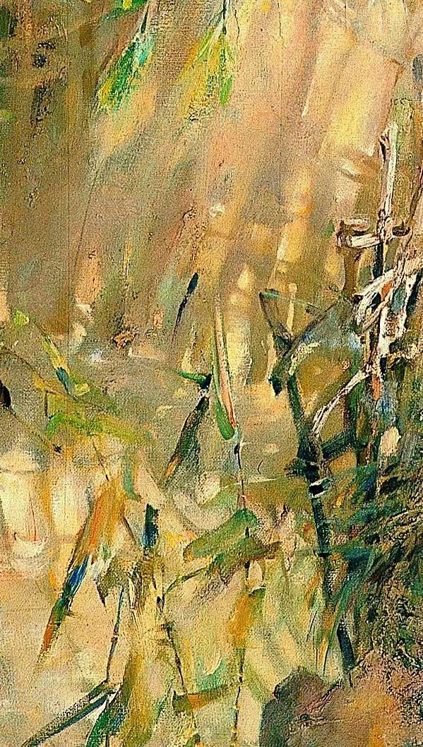 人物和背景中的物体若隐若现,除了少女的五官比较具体之外,画家没有刻意描绘人物的形体,以及其他对象的外形。阳光成为画面的主导,形色交融,穿插整个画面,一切显得自然而和谐,春意盎然,流露出春的无限生机,更显“一日之计在于晨,一年之计在于春”之主旨。