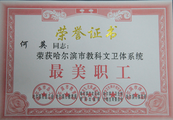 会上,表彰了哈尔滨市在教育、科技、文化、卫生、体育领域中作出突出贡献的职工。农工党哈尔滨市第一医院支部副主委,哈尔滨市第一医院消化二科主任、博士何英荣获 “最美职工”称号。