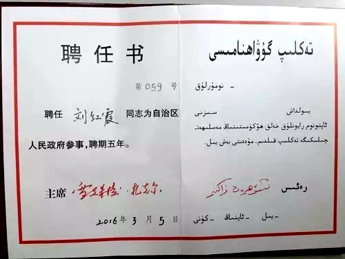 近日,新疆维吾尔自治区人民政府举行参事、馆员座谈会,向新任27位政府参事、12位文史研究馆馆员颁发了聘书。自治区中医医院皮肤科主任、农工党新疆维吾尔自治区中医医院支部主委刘红霞被聘为自治区人民政府参事。
