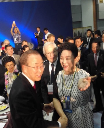 2016年5月25日,我应韩国国会、中韩地域经济协会邀请,参加2016年韩国“亚洲新秩序合作领导力”为主题的济州国际高峰论坛开幕式。并非常荣幸得到联合国秘书长潘基文、新加坡总理吴作栋、马来西亚总理马哈蒂尔、日本前首相村山富市、韩国外务大臣孔鲁明等领导人的亲自接见。本次高峰论坛来自全球的各国元首及各国使团代表五千余人。唯有我得到这样高规格的接待,此次活动对于任何一个人来说都是难能可贵的,作为一名农工党党员,长期研究书法艺术工作者,有如此殊荣,确实是很激动很受鼓舞。