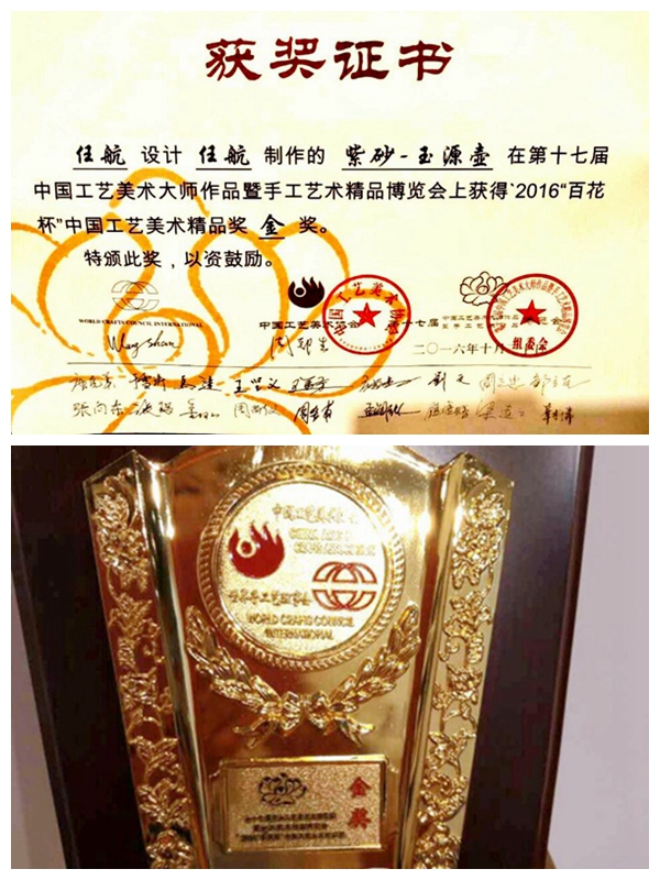 20161027日—31日,第十七届中国工艺美术大师作品暨手工艺术精品博览会在美丽的海滨城市山东青岛市国际会展中心隆重开幕。28日,农工党南通市文教支部党员任航老师设计并制作的紫砂-玉源壶荣获2016年“百花杯”中国工艺美术精品奖“金奖”。获奖证书由中国工艺美术协会和第十七届中国工艺美术大师作品暨手工艺术精品博览会组委会联合颁发,中国工艺美术协会会长周郑生等10多位专家亲笔签名。(黄瑛俊)
