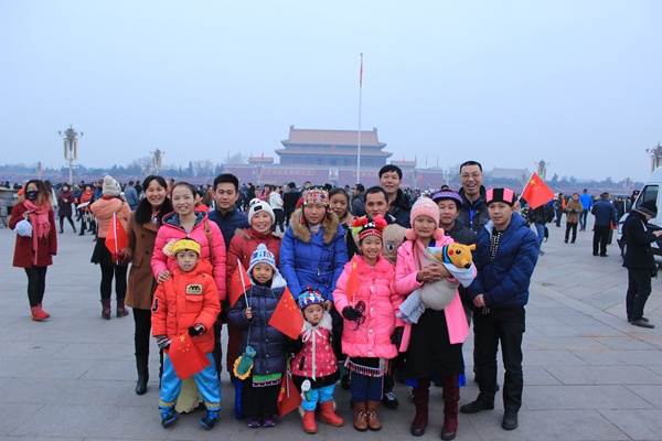 李卫刚(后排右一举国旗者)陪先心病儿童和家长去天安门看升国旗