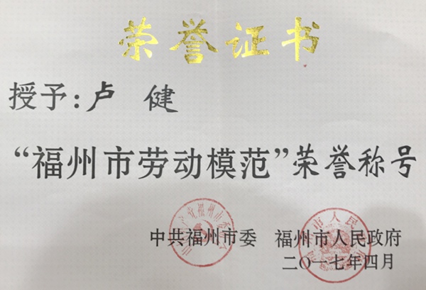 农工党党员卢健被福州市授予“劳动模范”称号